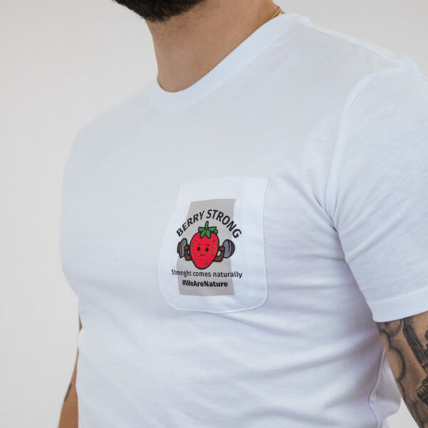 Egy fehér póló, amelyen egy súlyokat emelő eper erőteljes illusztrációja látható, valamint a merész „BERRY STRONG” felirat.A „Az erő természetesen jön”, szlogennel ez a póló játékos és motiváló módja annak, hogy megmutasd természetes erődet.
