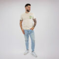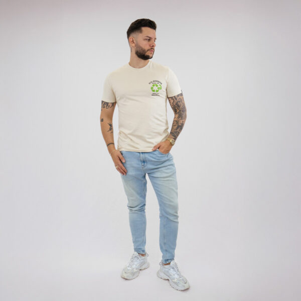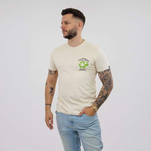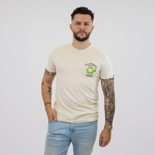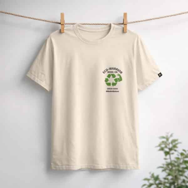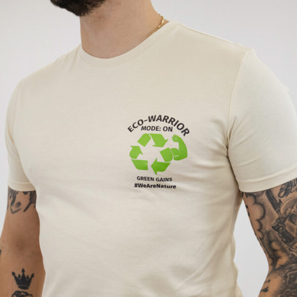Egy bézs színű póló, amelyen a feltűnő „ECO-WARRIOR MODE: ON” és „GREEN GAINS” felirat látható, valamint egy játékos illusztráció egy izmot feszítő zöld ökoszimbólummal. Ez a póló vidám és motiváló módja annak, hogy megmutasd az elkötelezettségedet a fenntarthatóság és az erő iránt.