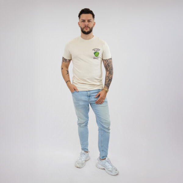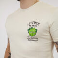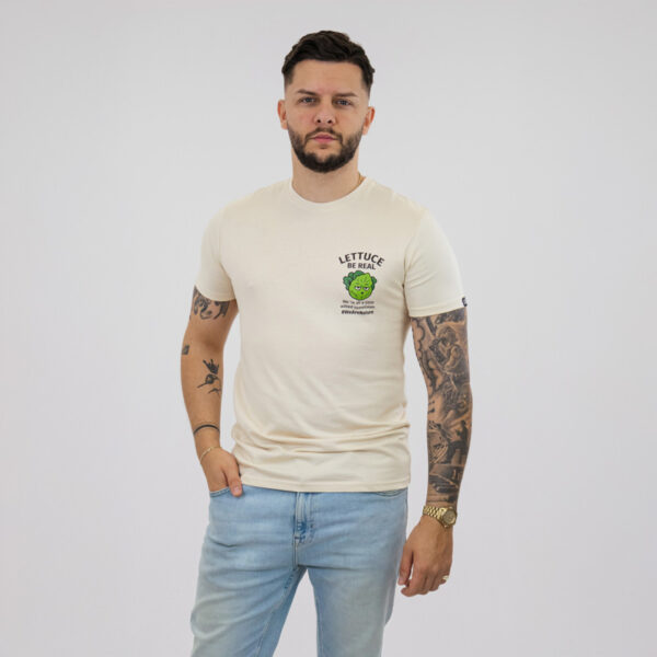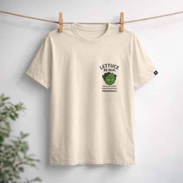 Egy bézs póló, amelyet a könnyed, hétköznapi stílushoz terveztek. A „Lettuce Be Real” felirattal és egy visszafogott, játékos grafikával az őszinteséget és az önmagadhoz való hűséget ünnepli.