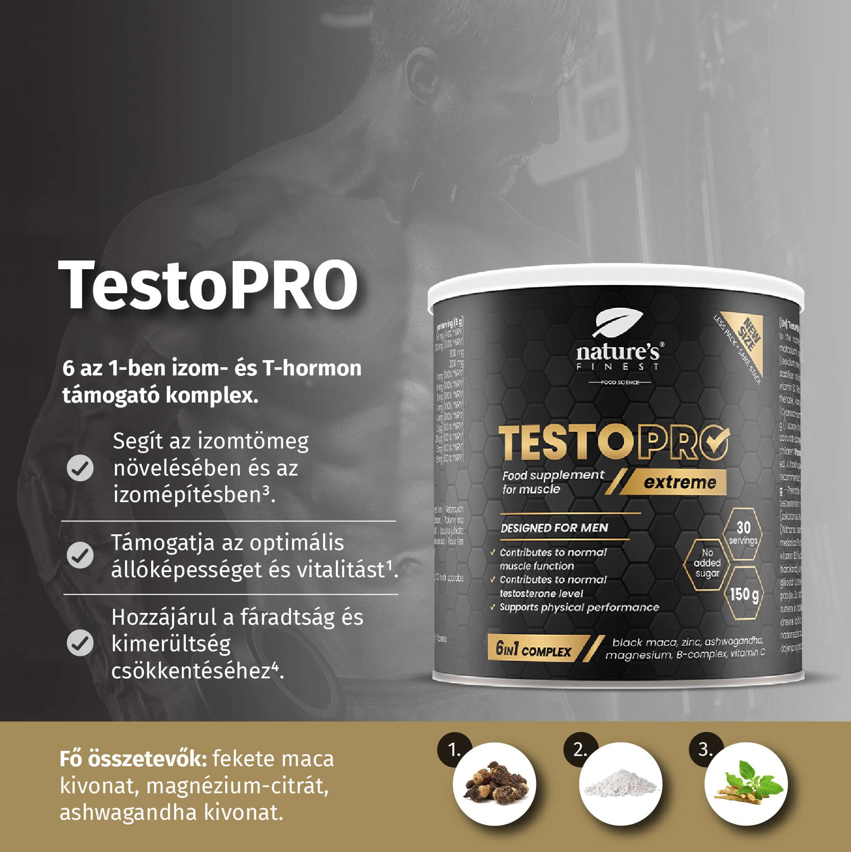 • TestoPRO Extreme: formula az izmok és a T-hormon támogatására⁷ – hozzájárul a normál T-hormonszinthez a vérben⁶, a magnézium pedig hozzájárul a fáradtság és kimerültség csökkentéséhez, valamint az izmok normál működéséhez.