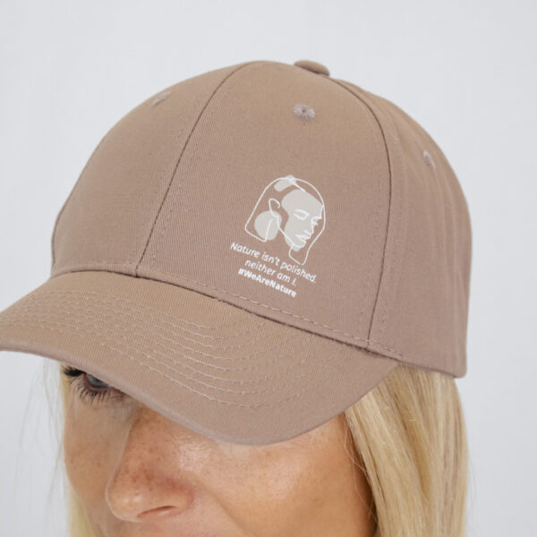 Egy minimalista barna sapka, amelyet a könnyed mindennapi stílushoz terveztek. Finom vonalrajzos grafikával és a „A természet nem tökéletesre csiszolt, én sem vagyok az” felirattal, letisztult fehér nyomattal emeli ki a hitelességet és a természetes magabiztosságot.