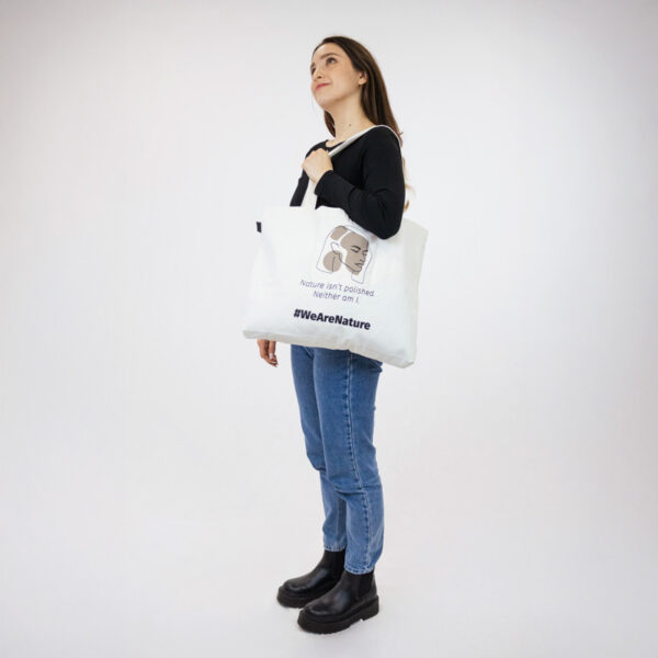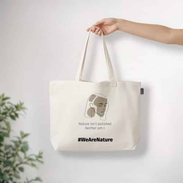 Időtlen bevásárlótáska, amelyet könnyed stílusra és mindennapi használatra terveztek. A rajta olvasható elgondolkodtató üzenet „A természet nem tökéletesre csiszolt. Én sem.”, valamint a nyugodt arcot ábrázoló minimalista vonalrajz az őszinteséget és a természetes szépség elfogadását ünnepli.