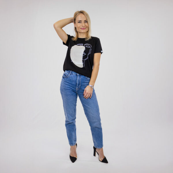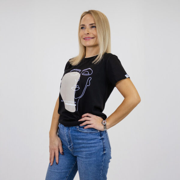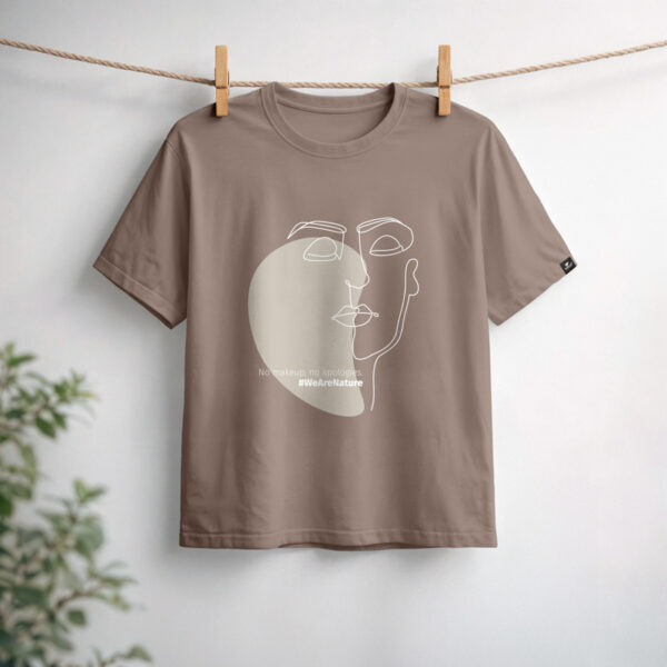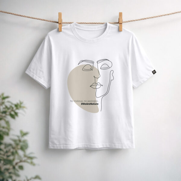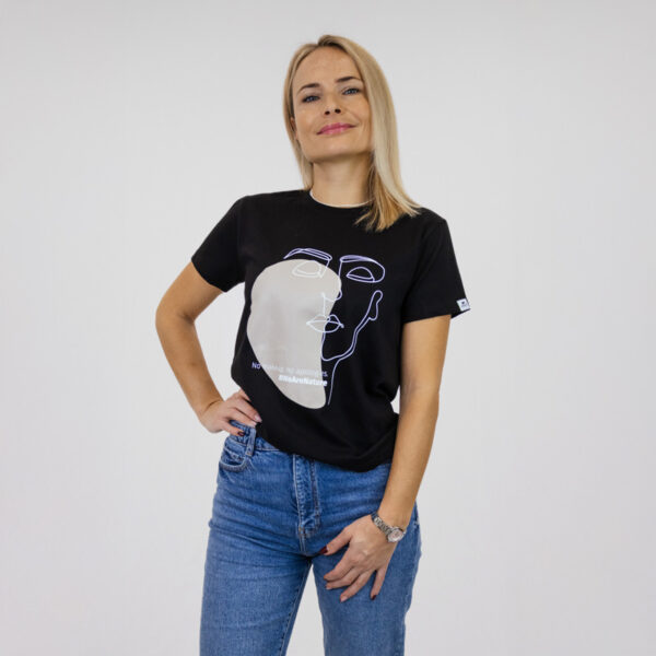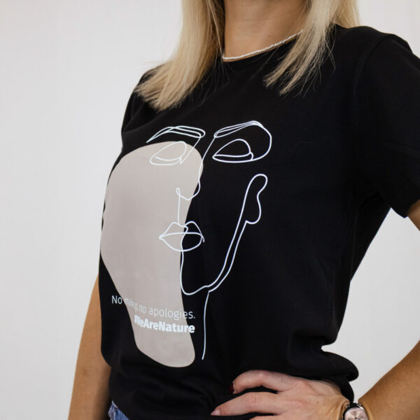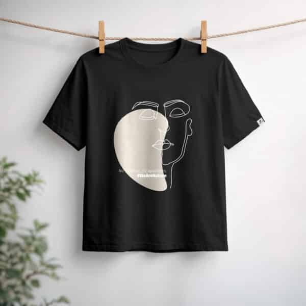 Egy minimalista fekete póló merész, mégis kifinomult művészi megjelenéssel. Az absztrakt vonalrajzos arcot lágy, semleges forma egészíti ki, valamint a „No makeup, no apologies.” üzenet, amely a természetes szépséget és a bocsánatkérést nem ismerő magabiztosságot ünnepli.