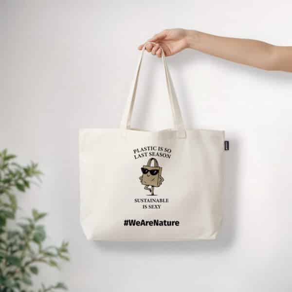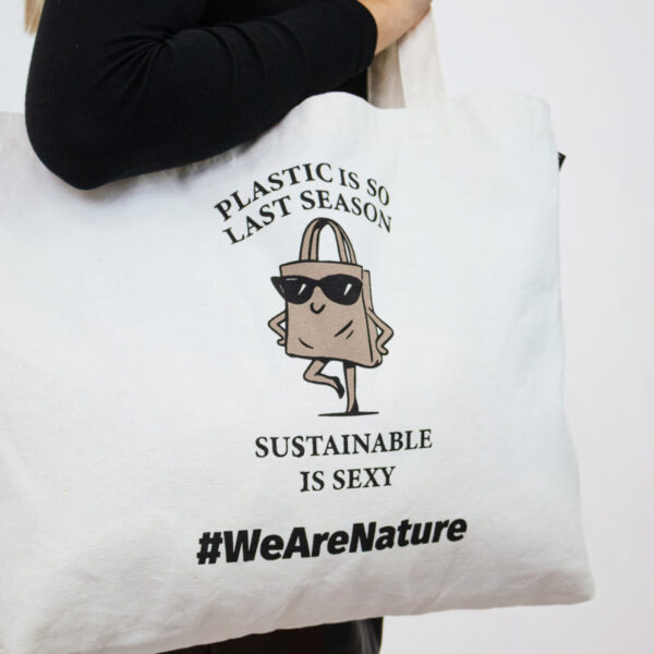 Időtálló vászontáska, amely a mindennapi stílust fenntartható szemlélettel ötvözi. A játékos „A műanyag már annyira a múlt szezon. A fenntarthatóság szexi.” felirattal és egy napszemüveges, magabiztos bevásárlótáskát ábrázoló bájos illusztrációval humorral és karakterrel gazdagítja a tudatos életmódot.