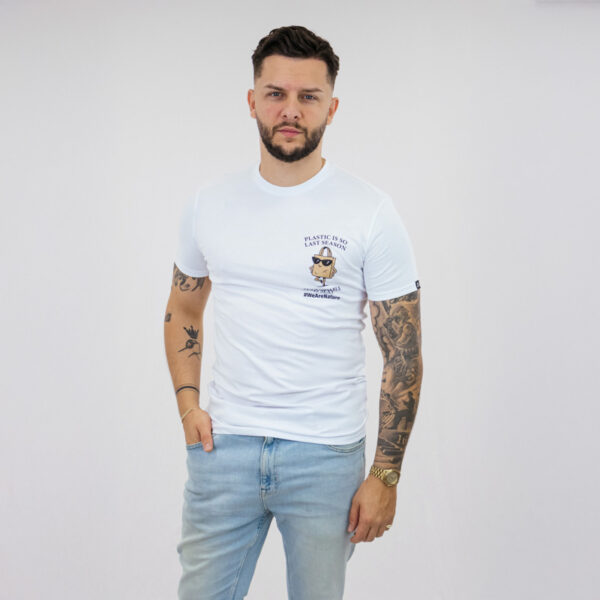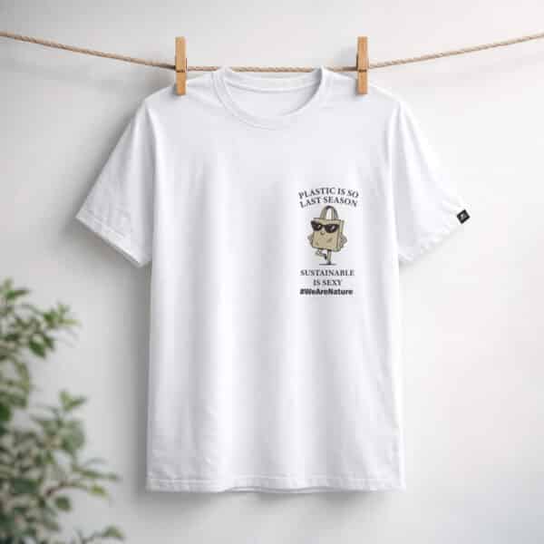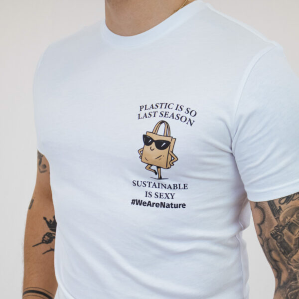 Minimalista fehér póló, amely ötvözi a stílust és a célt. A feltűnő grafikán látható merész üzenet „A műanyag már a múlt szezon. A fenntarthatóság szexi.” magabiztos, játékos karaktert ad bármilyen összeállításnak.