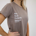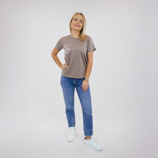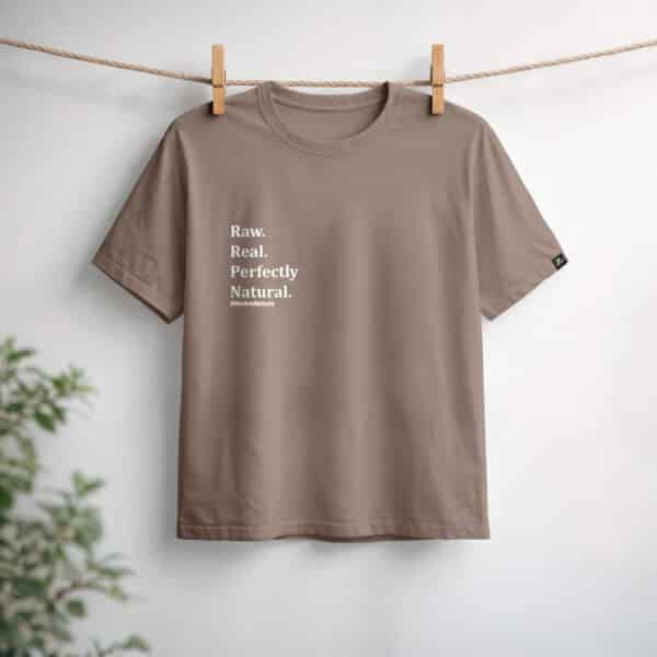 Egy minimalista barna póló, amelyet a könnyed, mindennapi stílushoz terveztek. A „Raw. Real. Perfectly. Natural.” felirat letisztult fehér nyomattal jelenik meg rajta, így a kényelmet hiteles, magabiztos megjelenéssel ötvözi.